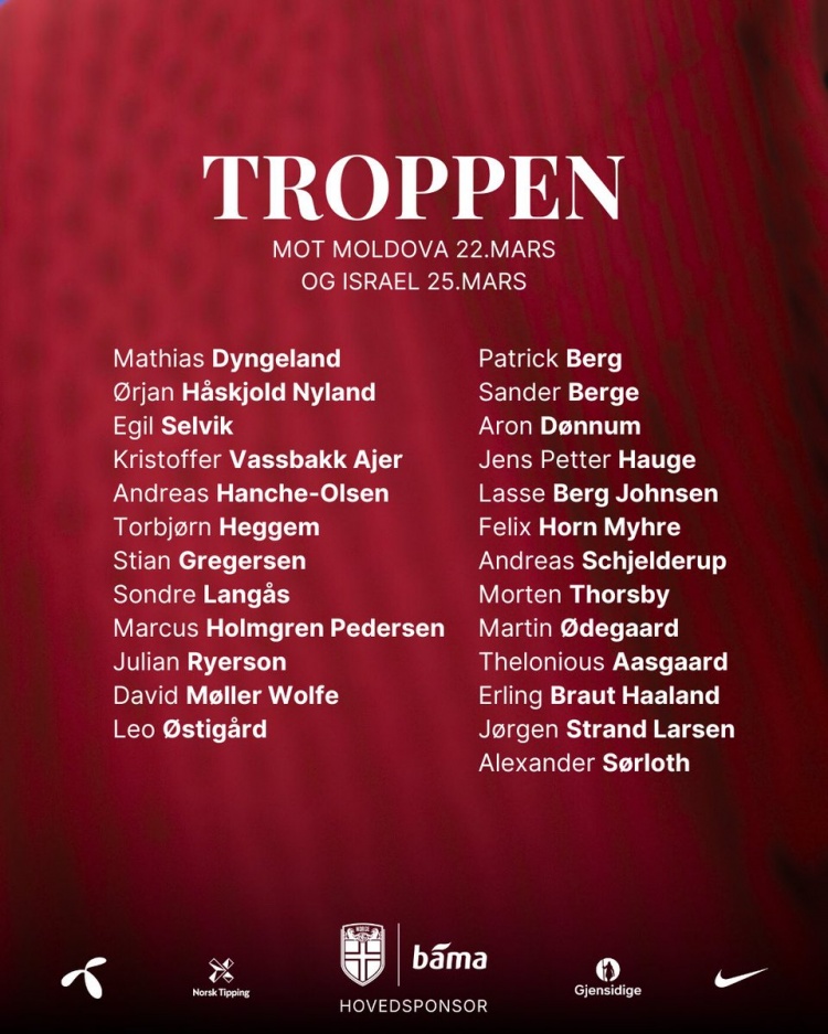 中前場:帕特里克-伯格(博德閃耀)、桑德-博格(富勒姆)、冬納姆(圖盧茲)、彼得-海于格(博德閃耀)、貝格-約翰森(馬爾默)、米赫埃(布蘭)、謝爾德魯普(本菲卡)、托斯比(熱那亞)、厄德高(阿森納)、阿斯高(盧頓)、哈蘭德(曼城)、拉爾森(狼隊)、索爾洛特(馬競)