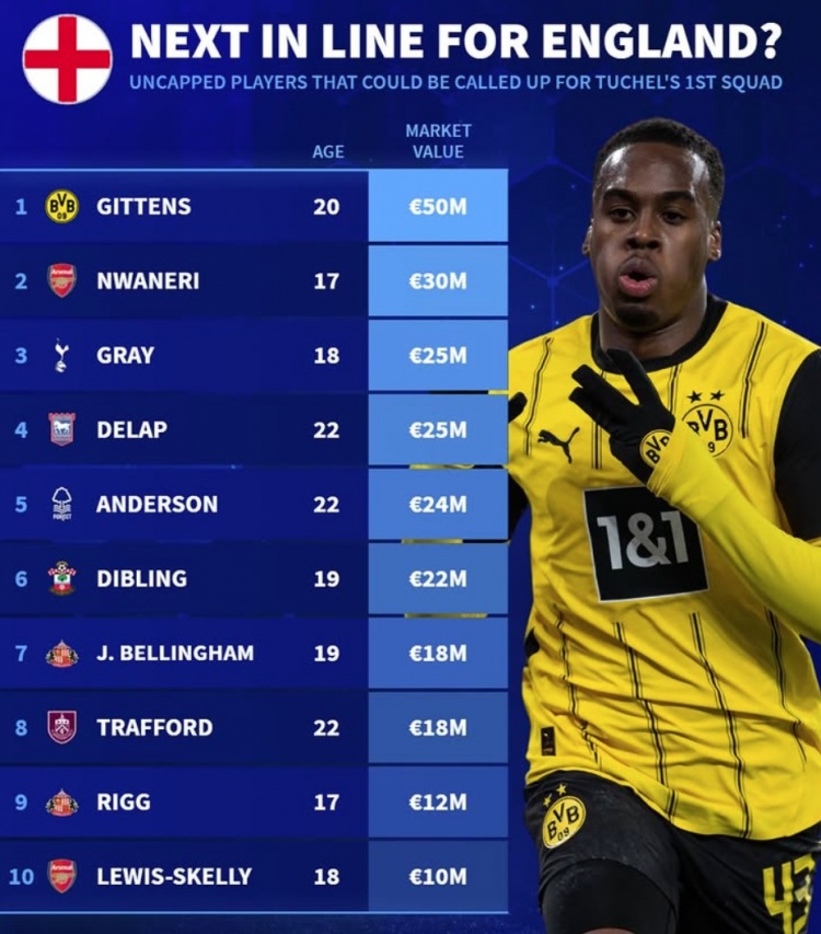 2月27日訊 《轉(zhuǎn)會市場》統(tǒng)計了當(dāng)前仍未被正式國家隊名單征召的英格蘭球員最貴身價情況,多特邊鋒吉滕斯領(lǐng)銜。