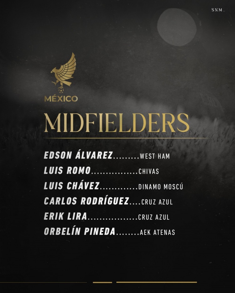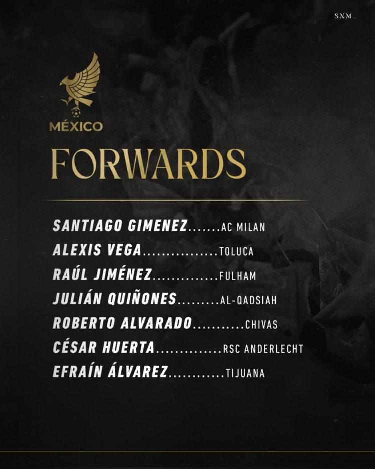 前鋒:圣地亞哥-希門尼斯(米蘭)、貝加(托盧卡)、勞爾-希門尼斯(富勒姆)、奎尼奧內(nèi)斯(卡迪西亞)、阿爾瓦拉多(瓜達拉哈拉)、韋爾塔(安德萊赫特)、埃弗林-阿爾瓦雷斯(蒂華納)