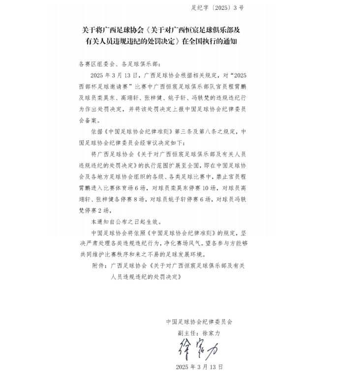 03月13日訊 中國足協(xié)發(fā)布官方公告,宣布對陜西聯(lián)合和廣西恒宸球員的停賽處罰擴(kuò)大到全國執(zhí)行。
