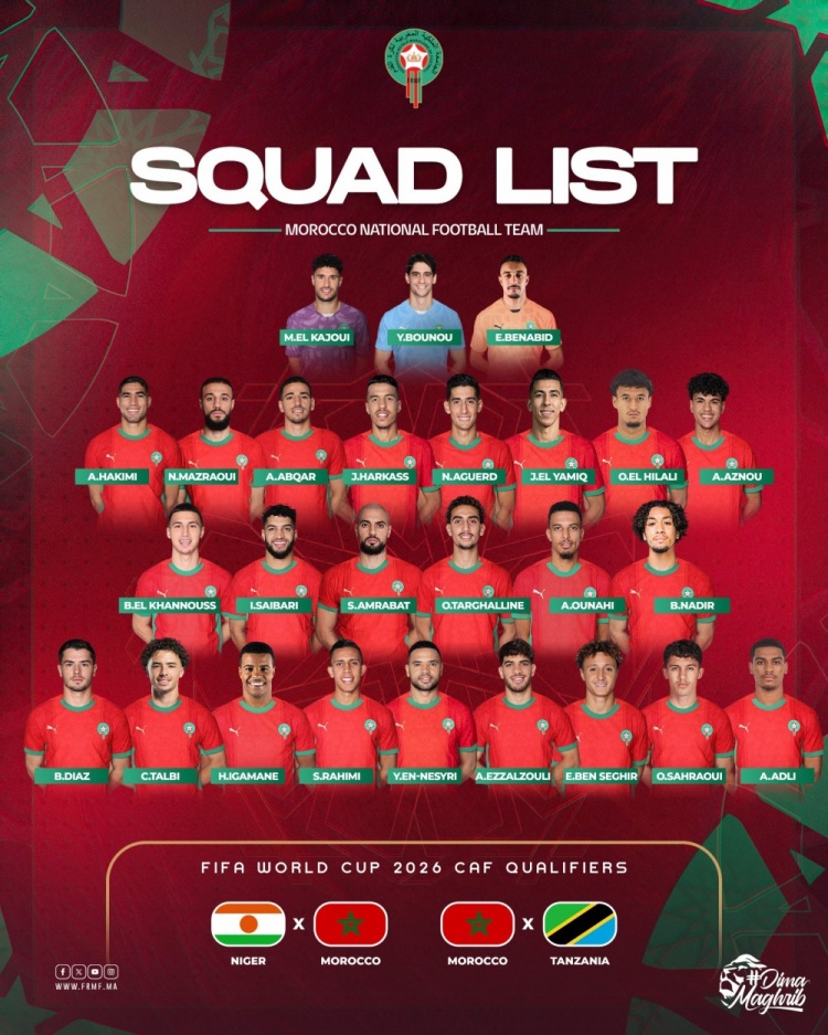 摩洛哥名單:阿什拉夫、馬茲拉維、布拉欣-迪亞斯、恩-內(nèi)斯里在列