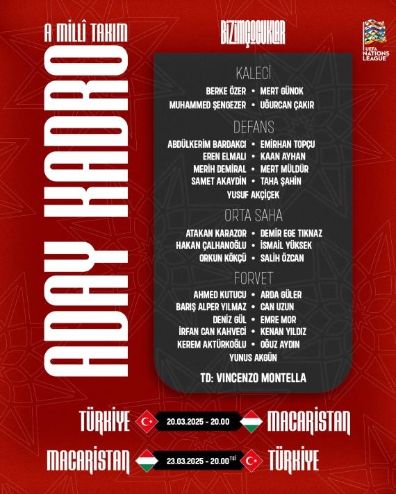 3月14日訊 土耳其最新一期名單公布,恰爾汗奧盧領銜,居勒爾、伊爾迪茲、科克庫、德米拉爾、厄茲詹等球員在列。