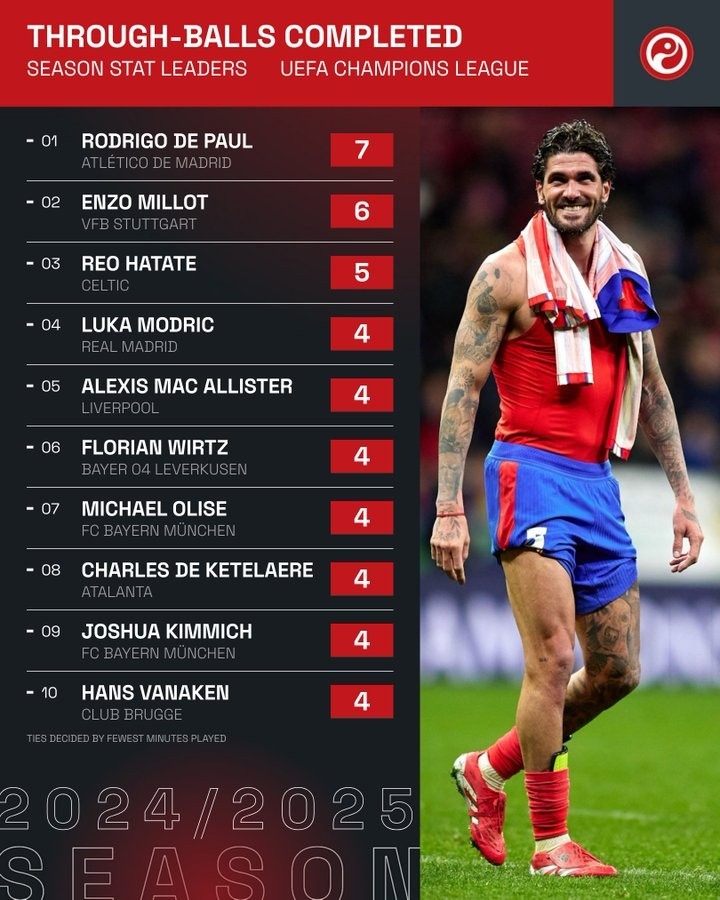 本賽季歐冠精準直塞榜:德保羅居首,魔笛、麥卡、維爾茨在列